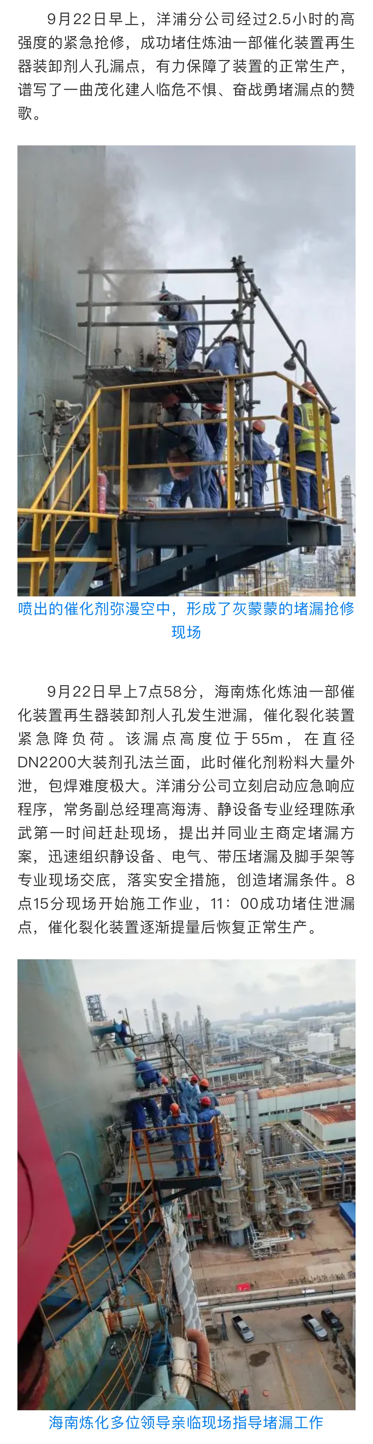洋浦分公司高強(qiáng)度作業(yè)2.5小時(shí),成功堵住再生器漏點(diǎn)